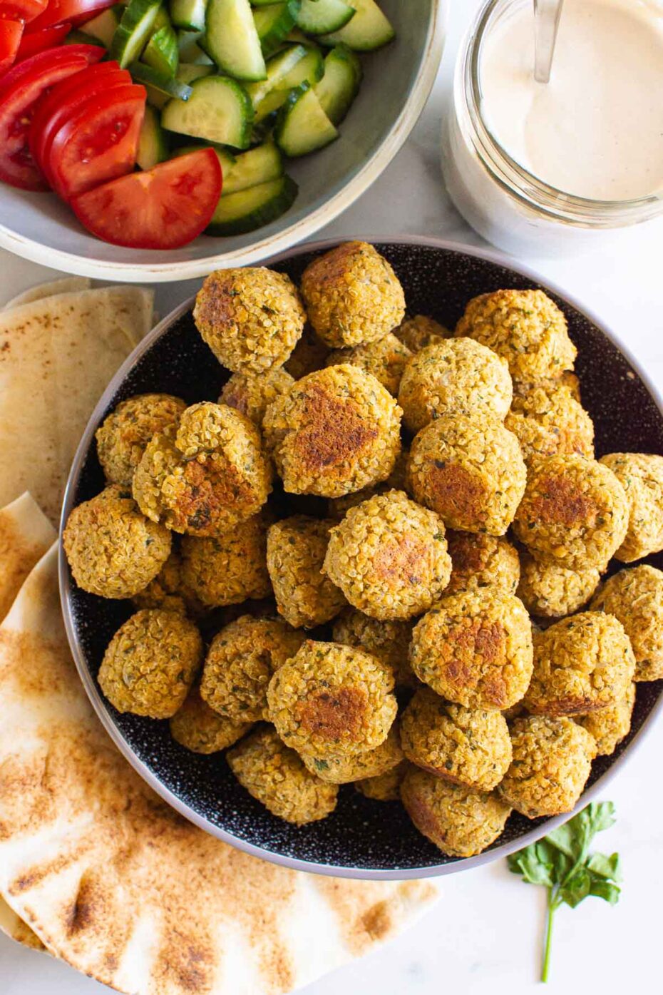 Much like rice, cooked quinoa can also be used as a filling substitute. You’ll see it used this way in this quinoa falafel. Quinoa works well when toasted up and used as a breading as well.