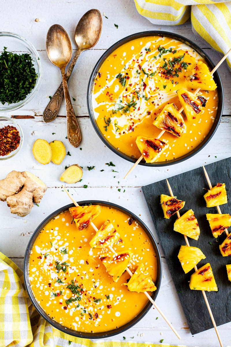 The sweet potato is the star of my ginger carrot sweet potato soup and once cooked and blended, makes for a thick bowl of velvety soup that is perfect for pairing with charred pineapple sticks.