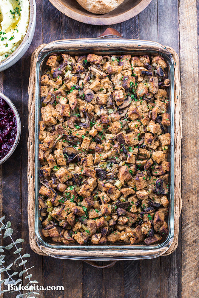 This Mushroom Stuffing recipe by Bakerita features toasted bread tossed with a wild mushroom, celery and onion mixture containing herbs like sage and thyme, which is then baked until crispy. Add apples, cranberries or roasted nuts for an even more festive finish.