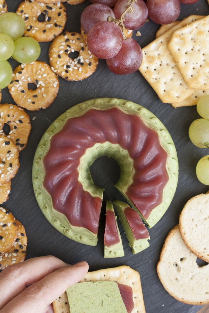 It is sure to be a stunning centerpiece of any vegan cheeseboard. You can even turn it into a holiday party platter if you add different dips like roasted eggplant walnut dip, classic hummus or beet hummus or cream cheese as well as different crackers, pretzels, raw veggie sticks (like bell pepper, celery, carrots, or cucumber), fruits (like grapes, apples, or pear), nuts (like pecans, walnuts, or almonds), olives, raisins, dried cranberries and so on. Wouldn’t it be a gorgeous way to start your Christmas dinner? Browse through our Vegan Dips gallery for more inspiration.
