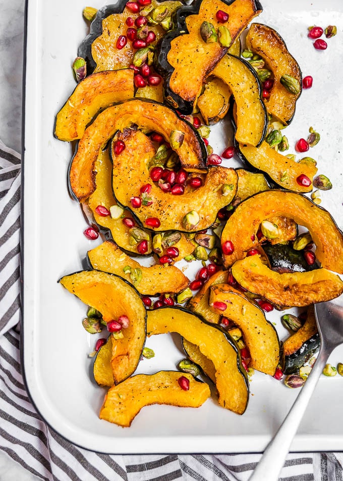 This Roasted Acorn Squash recipe by A Dash of Megnut only requires six ingredients to make, but is so beautiful and full of flavor. In this dish, acorn squash is topped with pomegranate seeds and salted pistachios, both of which contribute to its exemplary taste. The result truly is a feast for the eyes and for the palate.