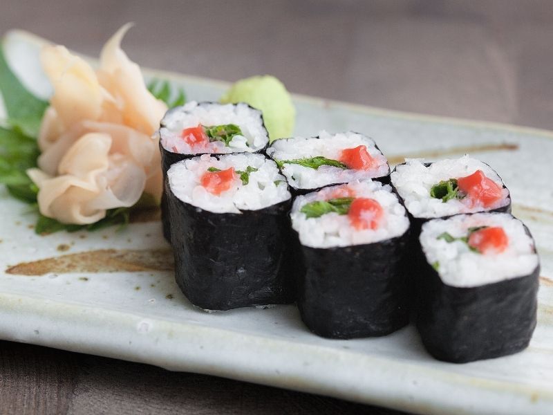 If you’re feeling adventurous and want to try something new, the ume shiso maki is the sushi roll you’re looking for. This makizushi is prepared by combining the salty Japanese plum (ume) paste with the sweet flavors of cucumbers and Japanese mint (shiso). The refreshing maki rolls can be used as a palate cleanser or to round off a meal.