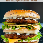 Why is it the meatiest vegan beef burger? Because it has a chewy, ground beef-like texture (thank you TVP), and it does not taste like veggies at all. It holds together during grilling and frying, even if you make thin patties. It is juicy and moist (not mushy) on the inside, but has a crispy crust on the outside. Did I mention it is also gluten-free!