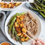 This miso soba noodles recipe combines an easy, no-cook spicy tahini miso sauce with soba noodles, crispy tofu bites, and roasted asparagus for a delicious vegan family meal.
