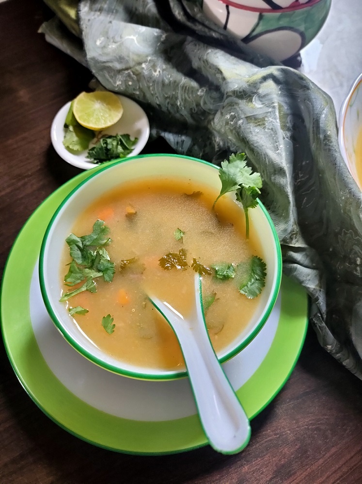 This light vegetable soup is actually a nutrient-packed veggie stock seasoned with fresh coriander leaves, garlic and freshly squeezed lemon juice. This Lemon Coriander Soup from Veg Buffet can be a light mid-day meal or an evening tea replacement or a cosy soup to feel better if you catch a cold.