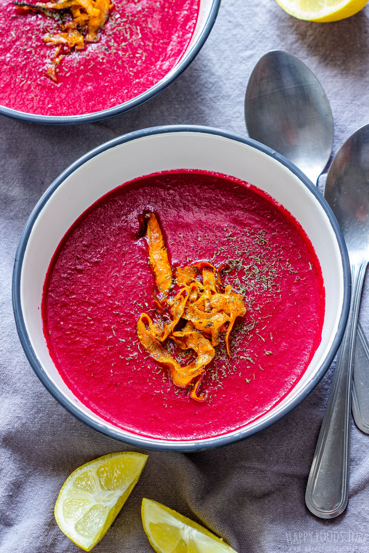 Who can resist such a vibrant pink soup? I sure cannot. Coconut milk pairs perfectly with the earthy flavors of beetroot. And look at the carrot shavings. They are just another colorful topping that makes it even more appetising. Don’t hesitate to try this Over Roasted Beet Soup from Happy Foods Tube when you have some beets at hand.
