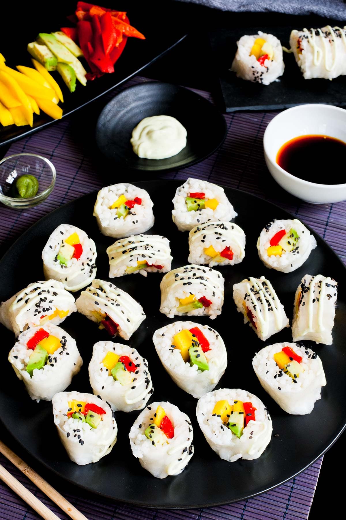 This rice paper sushi without seaweed is a refreshing twist on traditional sushi. It is filled with mango, avocado, and roasted red pepper slices, then drizzled with creamy wasabi mayonnaise and sprinkled with black sesame seeds.