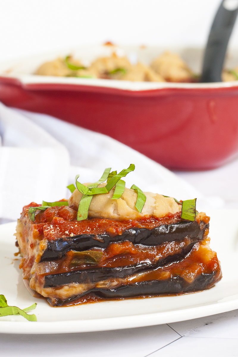 Now you have the roasted eggplant slices, the Pomodoro sauce, and the vegan cheese sauce. You are ready to assemble this perfectly light but rich and filling vegan eggplant parmigiana.